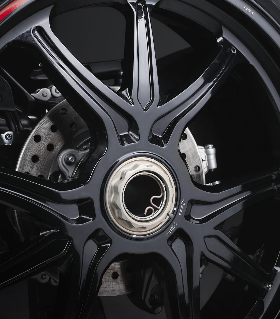 The 1000cc inline 4-cylinder engine has been updated to comply with Euro5+ standards, delivering a maximum power of 201 HP at 13,500 rpm and 116 Nm of torque at 11,000 rpm. Handcrafted in Varese, it features 16 radial titanium valves, forged titanium connecting rods, and DLC-coated cams. The updated engine is more responsive at lower revs, ensuring smoother performance with minimal vibration.