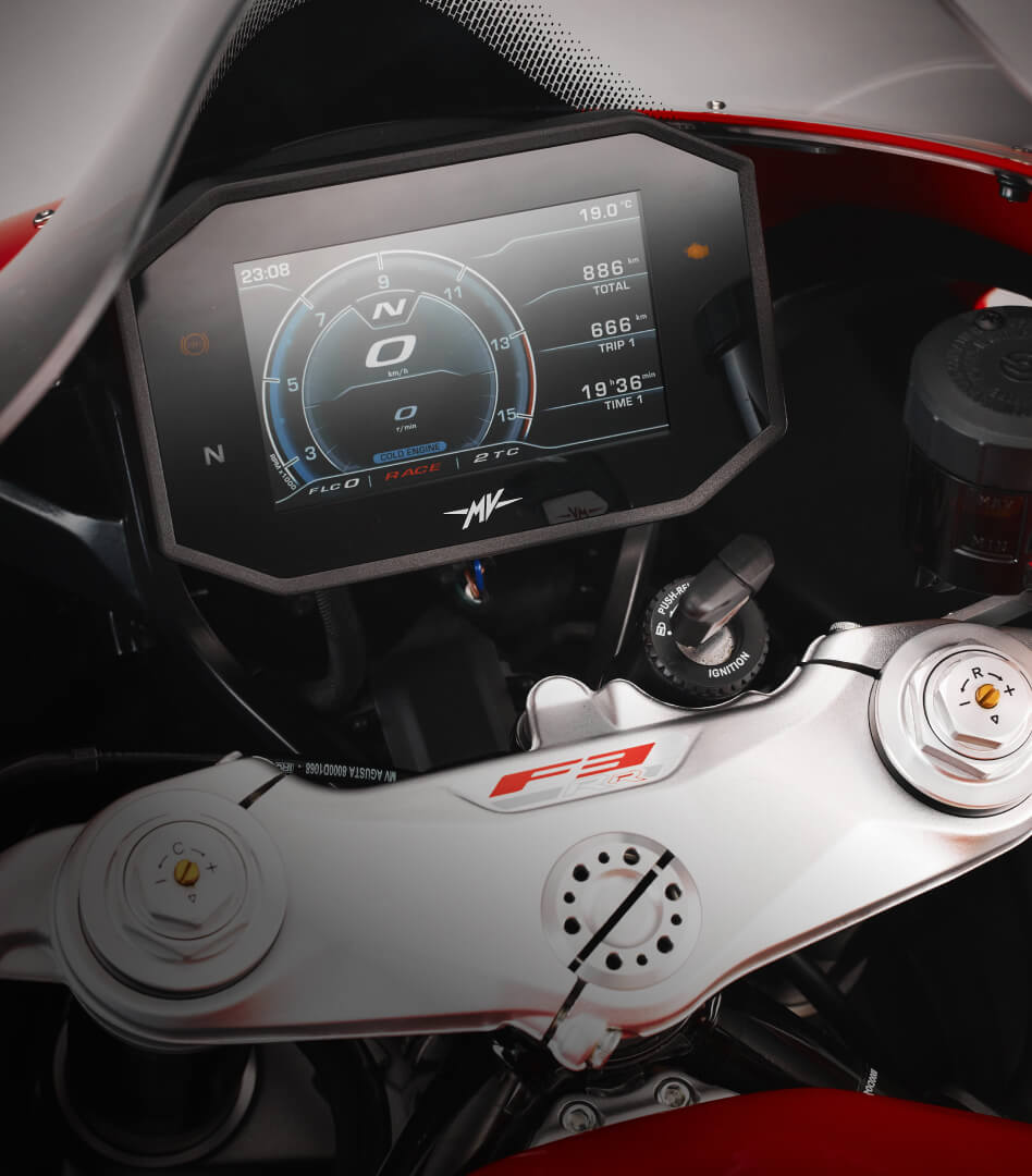 The electronics of the F3 RR; utilise an advanced 6-axis inertial platform, which provides all the necessary data for the efficient operation of various controls based on lean angle and other parameters. This integration ensures that safety and performance are inherently linked. The ABS features a cornering function to enhance safety even during turns, while the traction control system intervenes with precision, also taking the bike’s lean angle into account. Additionally, the Front Lift Control (FLC) not only prevents tipping over but also manages wheelies, striking a balance between fun, safety, and performance. The Launch Control allows for explosive starts on the track, further elevating the riding experience.