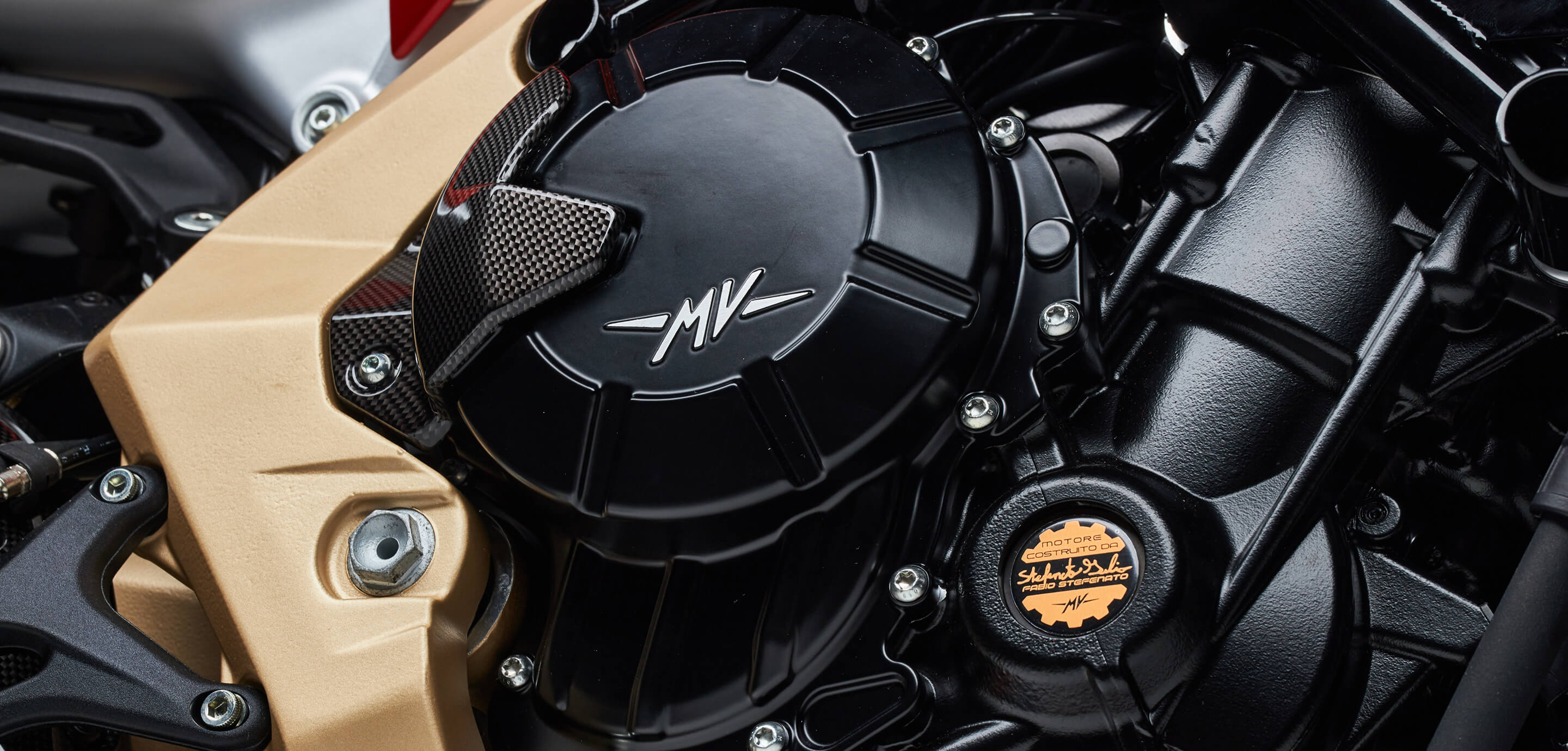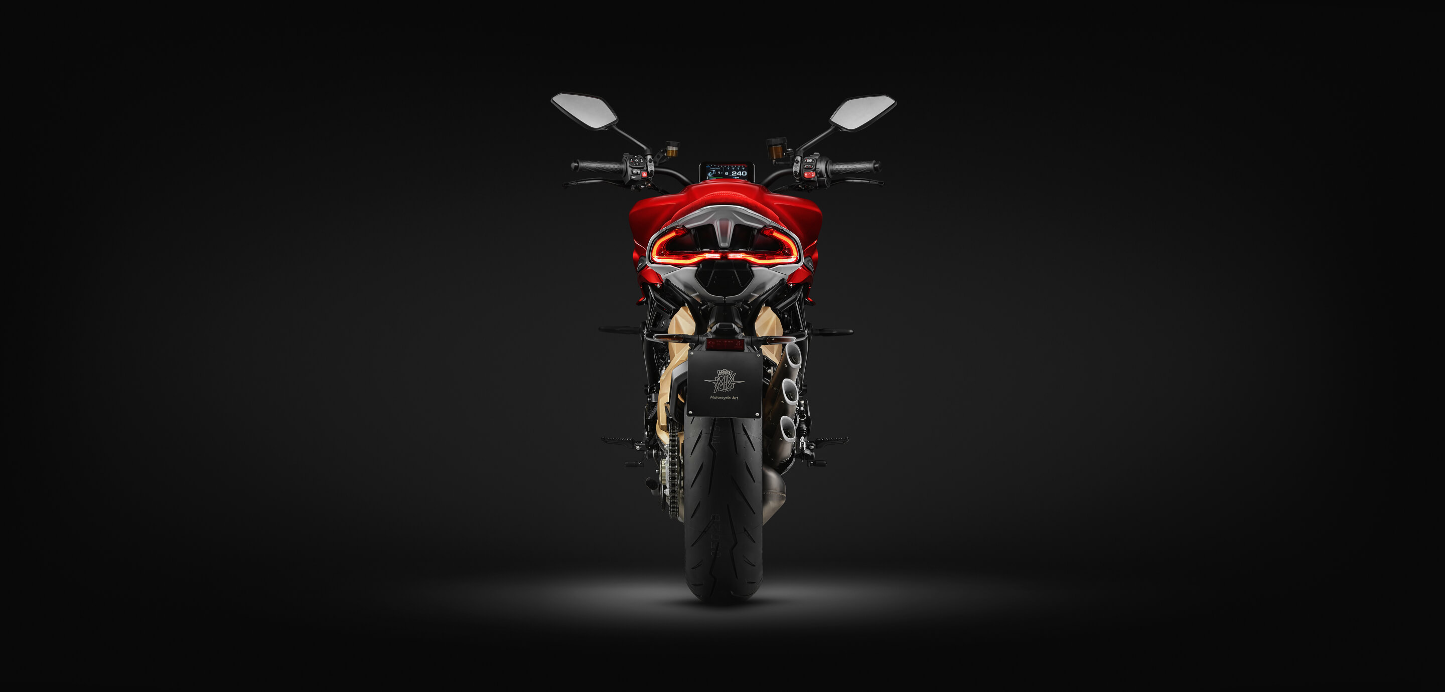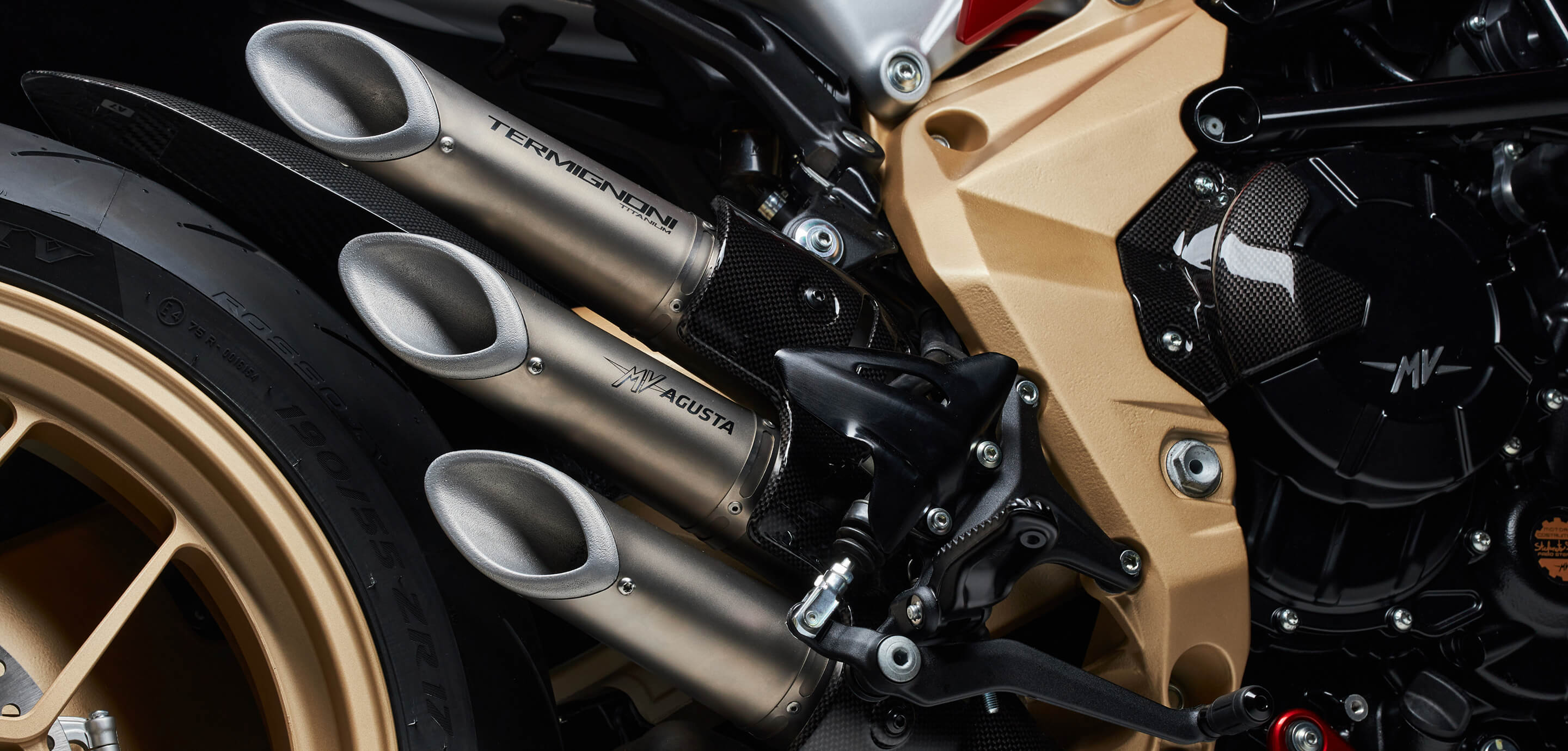 A titanium Termignoni slip-on exhaust amplifies performance and sound while saving weight, paired with a lithium battery for maximum efficiency. Carbon fibre components — extending from front to rear — further reduce weight and emphasize the Brutale Serie Oro’s pure racing DNA.