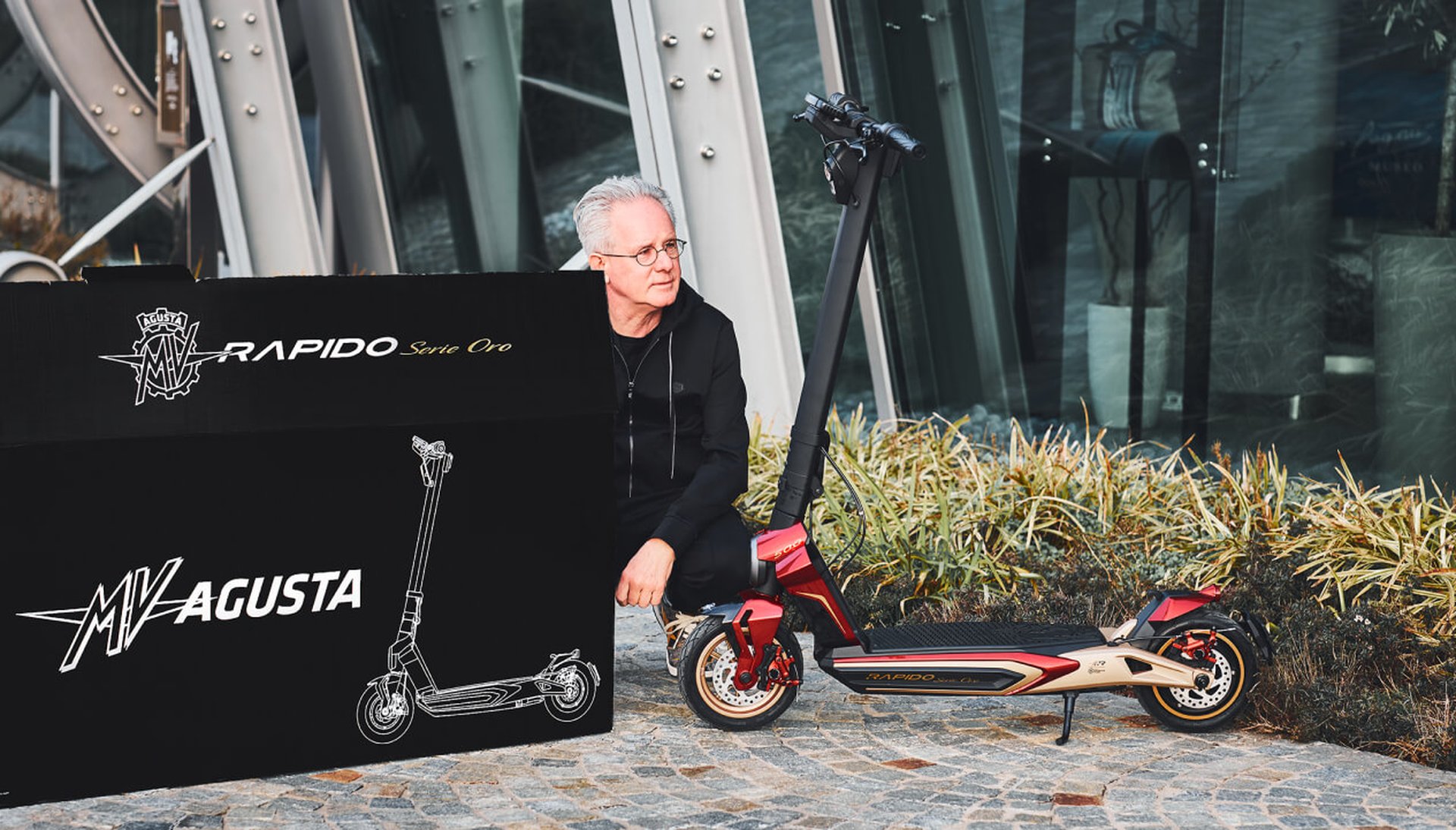 Special delivery in San Cesario sul Panaro, Pagani Automobili headquarters. Our friend and supporter Horacio Pagani, founder of the Motor Valley supercar brand, received a Rapido Serie Oro kick scooter. The Rapido, latest jewel of the MV Agusta's e-mobility world, has brought a wave of innovation to the world of micro-mobility thanks to its sophisticated and unconventional design, with a marked family feeling with MV motorcycles.